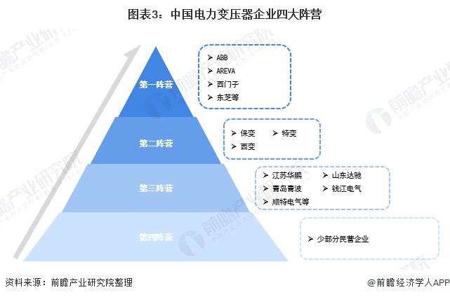 中国变压器企业可以分为四大阵营:ABB、AREVA、西门子、东芝等几大跨国集团公司以技术和管理优势形成了第一阵营;保变、特变、西变等国内大型企业通过提升产品的技术水平和等级,形成第二阵营;以江苏华鹏变压器有限公司、青岛青波变压器股份有限公司、顺特电气有限公司、山东达驰电气股份有限公司、杭州钱江电气集团有限公司等为代表的制造企业形成了第三阵营;不少民营企业由于经营机制灵活,没有非生产性的负担,也形成了一定的市场份额,形成第四阵营。