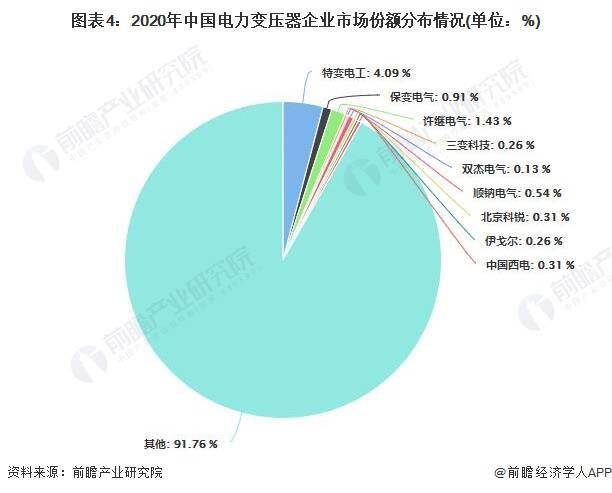 从我国变压器企业变压器的销售收入占总变压器的销售收入来看,在我国电力变压器行业中,规模化、集约化、大型集团骨干企业如特变电工、中国西电、保变,占据市场份额接近10%。其中,特变电工市场份额为4.09%,处于领先地位。但总体来看,我国电力变压器市场仍较为分散,市场集中度较低。